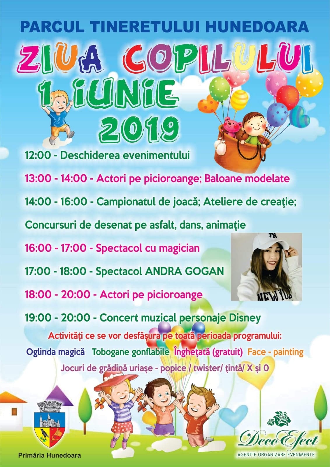 Primăria Municipiului Hunedoara in colaborare cu Direcția de Asistență Socială, organizează sâmbătă, 1 iunie 2019, evenimentul „Ziua Internațională a Copilului”. Activitățile dedicate celor mici vor avea loc în Parcul Tineretului din municipiul Hunedoara, între orele 12:00 – 20:00.