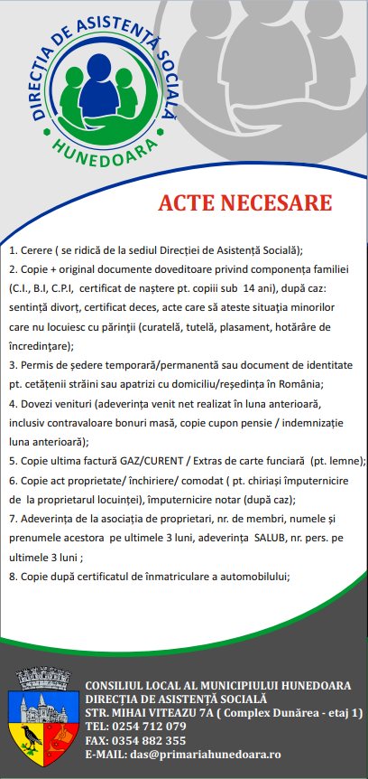 Direcția de Asistență Socială Hunedoara vă informează că începând cu săptămâna viitoare se pot depune cererile și declarațiile pe proprie răspundere necesare pentru obținerea ajutoarelor pentru încălzirea locuințelor cu gaze naturale, energie electrică și combustibili solizi sau petrolieri în sezonul rece 2022-2023. Formularele se pot obține de la sediul Direcției de Asistență Socială Hunedoara, din strada Mihai Viteazu, nr. 7A (în incinta fostei piețe Dunărea).