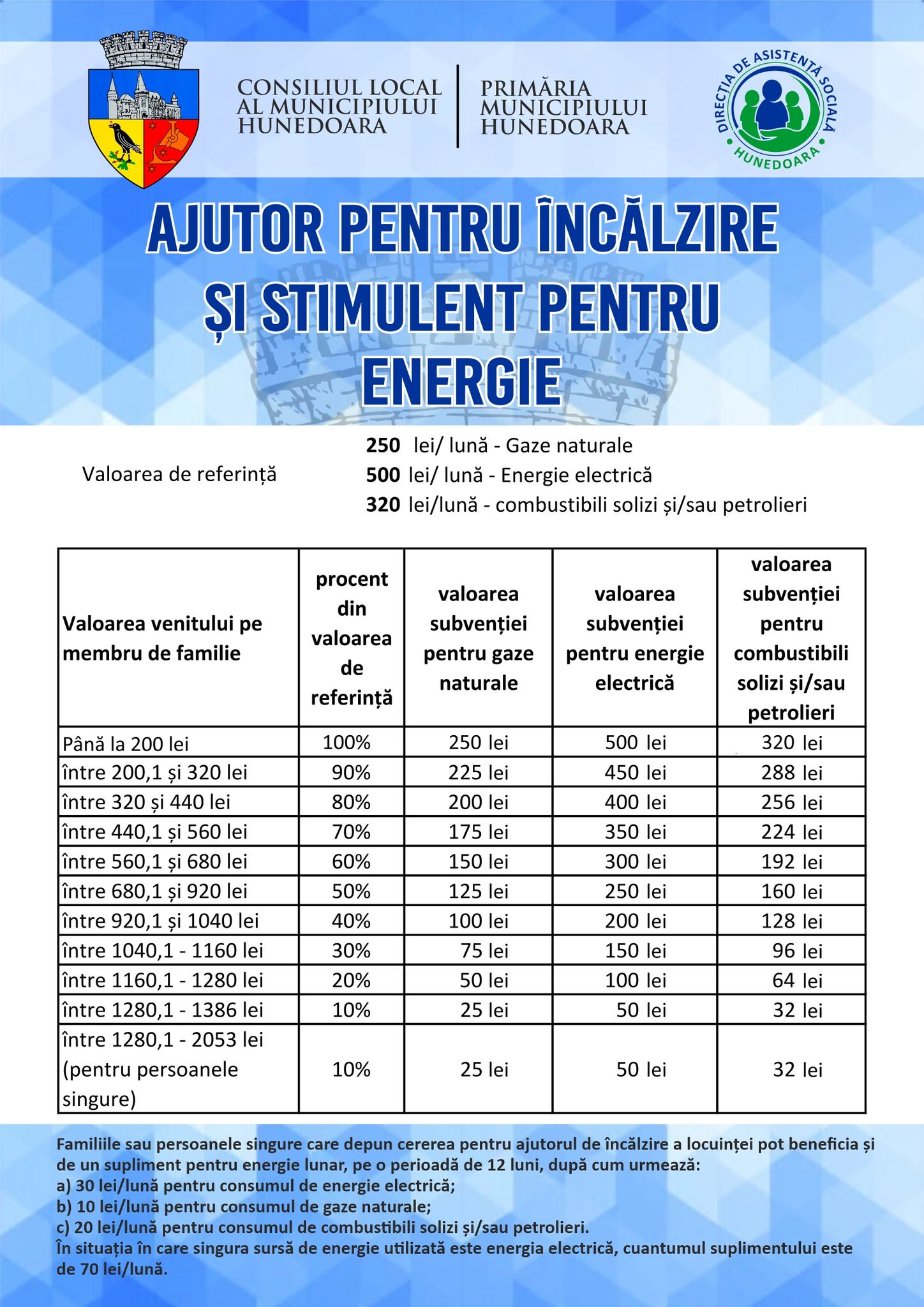 Suplimentul pentru energie se acordă cumulat în funcție de sursele de furnizare a energiei utilizate în locuință. Familiile și persoanele singure ale căror venituri sunt de până la 1.386 lei, respectiv a persoanei singure al cărei venit este de până la 2.053 lei beneficiază lunar , inclusiv în perioada sezonului rece, de un supliment pentru energie în sumă fixă, acordat în funcție de sursele de furnizare a energiei utilizate, în cuantum de: