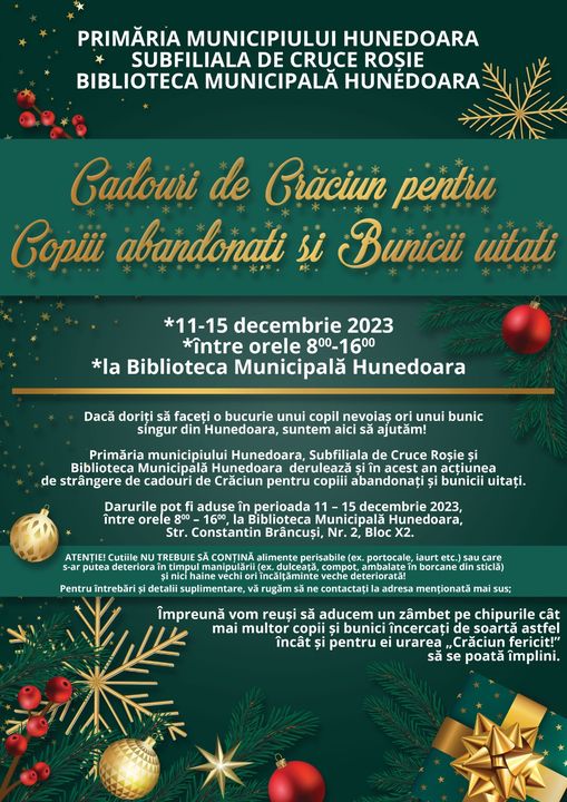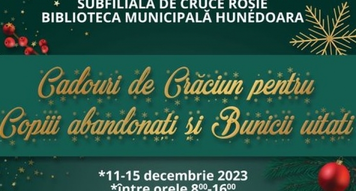 Dacă doriți să faceți o bucurie unui copil nevoiaș ori unui bunic singur din Hunedoara, suntem aici să ajutăm! Primăria municipiului Hunedoara, subfiliala de Cruce Roșie și Biblioteca Municipală Hunedoara derulează și în acest sfârşit de an acțiunea de strângere de cadouri de Crăciun pentru copiii abandonați și bunicii uitați.