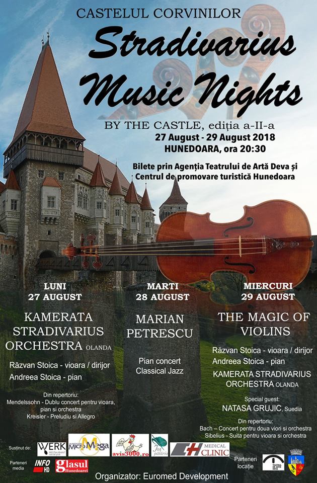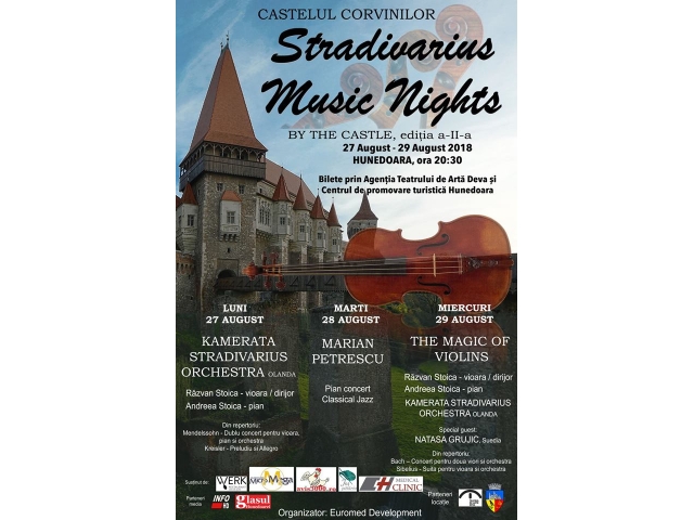 Teatrul De Artă Deva și Primăria Hunedoara vă invită la Stradivarius Music Nights by the Castle - ediția a-II-a, care va avea loc la Muzeul Castelul Corvinilor, în perioada 27 - 29 august 2018.