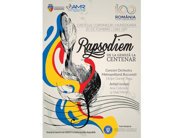 Primăria municipiului Hunedoara și AMR - Asociaţia Municipiilor din România vă invită sâmbătă, 20 octombrie 2018, la Castelul Corvinilor, la concertul susținut de Orchestra Metropolitană București; dirijor: Daniel Jinga; artiști invitați: Ana Cebotari și Vlad Miriță. Concertul va avea loc în curtea exterioară a Castelului, începând cu ora 18:00 și face parte din proiectul "RAPSODIE - De la geneză la CENTENAR", cofinanțat de Ministerul Culturii și Identității Naționale.