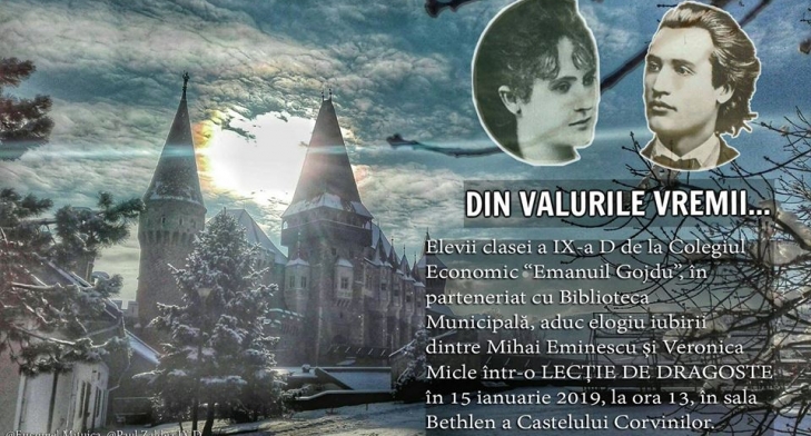 Elevii clasei a IX-a D de la Colegiul Economic „Emanuil Gojdu”, în parteneriat cu Biblioteca Municipală Hunedoara, aduc elogiu iubirii dintre Mihai Eminescu și Veronica Micle într-o LECȚIE DE DRAGOSTE, astăzi, 15 ianuarie 2019, de la ora 13:00, în sala Bethlen a Castelului Corvinilor.