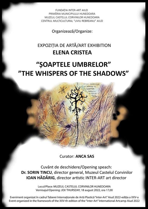Astăzi 18 august 2022 la orele 17.00, în Sufrageria Palatului Bethlen - Muzeul Castelul Corvinilor Hunedoara, va avea loc vernisajul expoziţiei de artă: The whispers of the shadows realizată de Elena Cristea