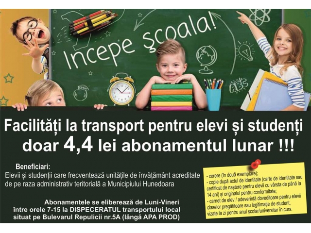 Elevii și studenții care frecventează unitățile de învățământ acreditate de pe raza unității administrativ-teritoriale a municipiului Hunedoara beneficiază de abonamente cu tarif redus: doar 4,40 lei/lună.