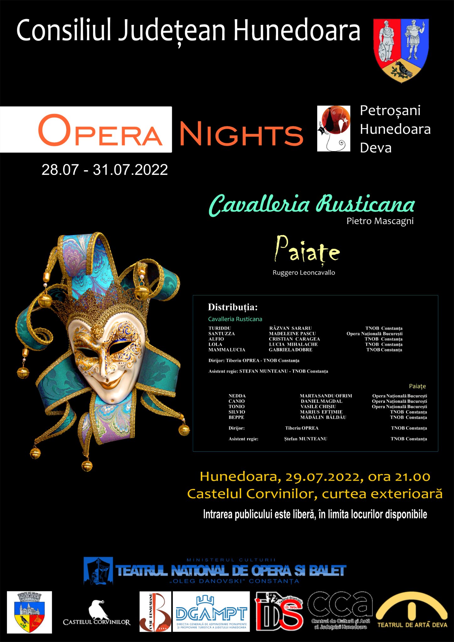 Astfel, vă așteptăm vineri, 29 iulie, de la ora 21.00, la Muzeul Castelul Corvinilor (în curtea exterioară), pentru operele Cavalleria Rusticana (Pietro Mascagni) și Paiațe (Ruggero Leoncallo), iar sâmbătă, 30 iulie, de la aceeași oră și în aceeași locație la Rigoletto (Giuseppe Verdi) – pentru două nopți magice!