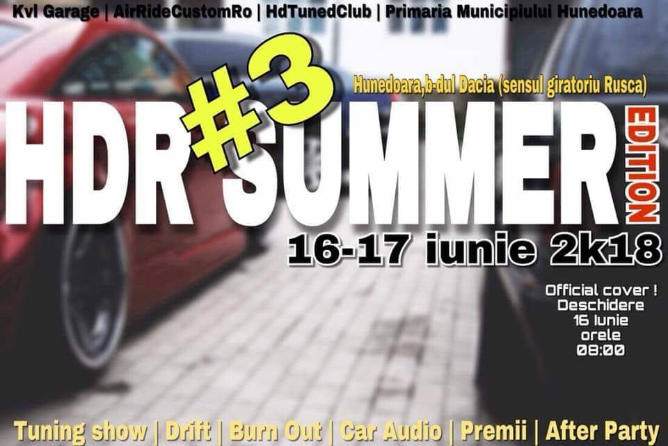 Primăria Municipiului Hunedoara și Asociația "HdTunedClub" vă invită în zilele de 16 și 17 iunie 2018, la evenimentul "HDR Tuning Show", care va avea loc în municipiul Hunedoara, pe Bulevardul Dacia (sensul giratoriu Rusca).