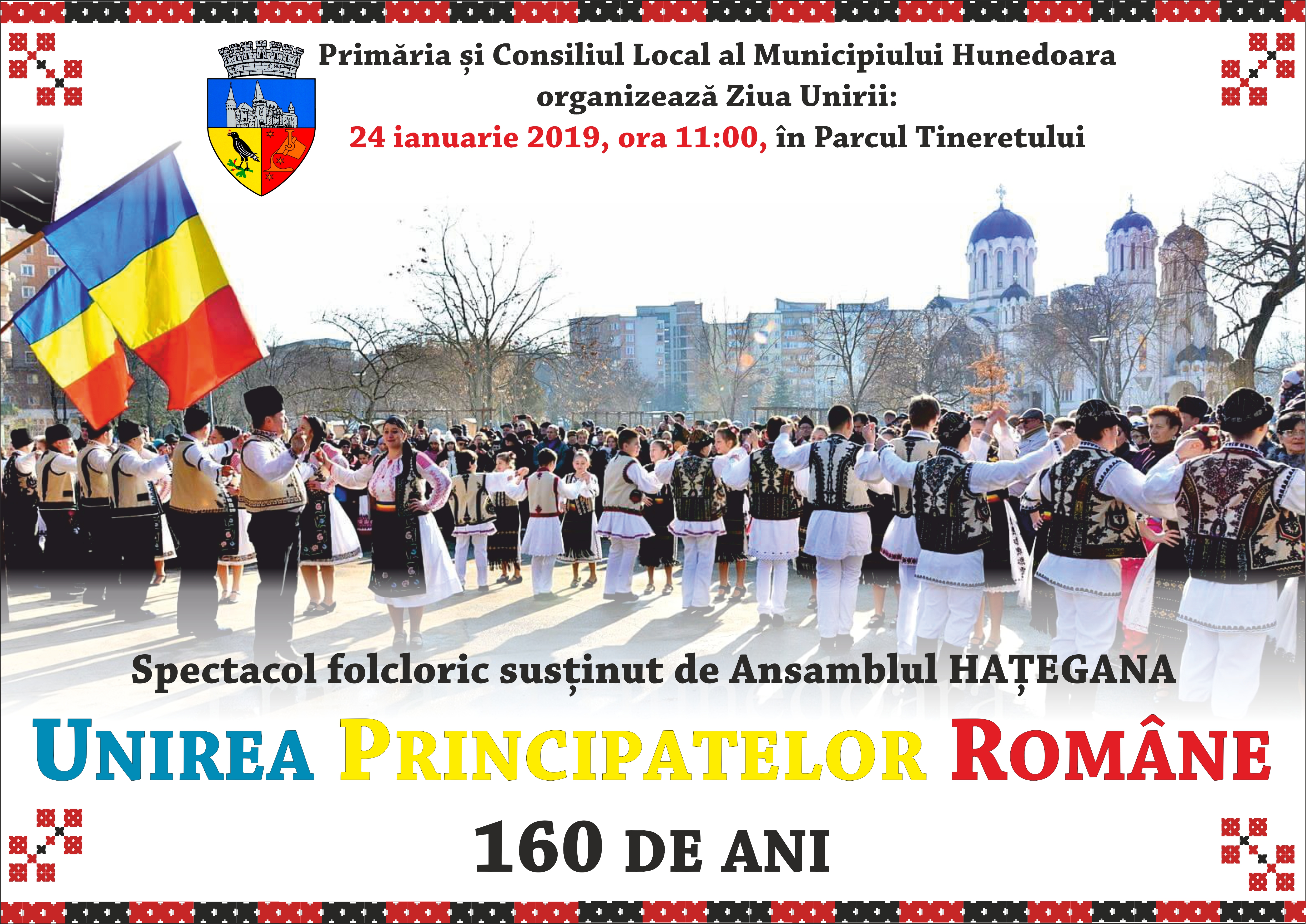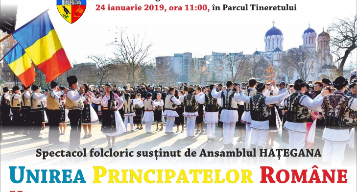 Primăria și Consiliul Local al Municipiului Hunedoara organizează joi, 24 ianuarie 2019, cu ocazia împlinirii a 160 de ani de la Unirea Principatelor Române, un spectacol de dans și muzică populară susținut de Ansamblul de Cântece și Dansuri „Hațegana”.