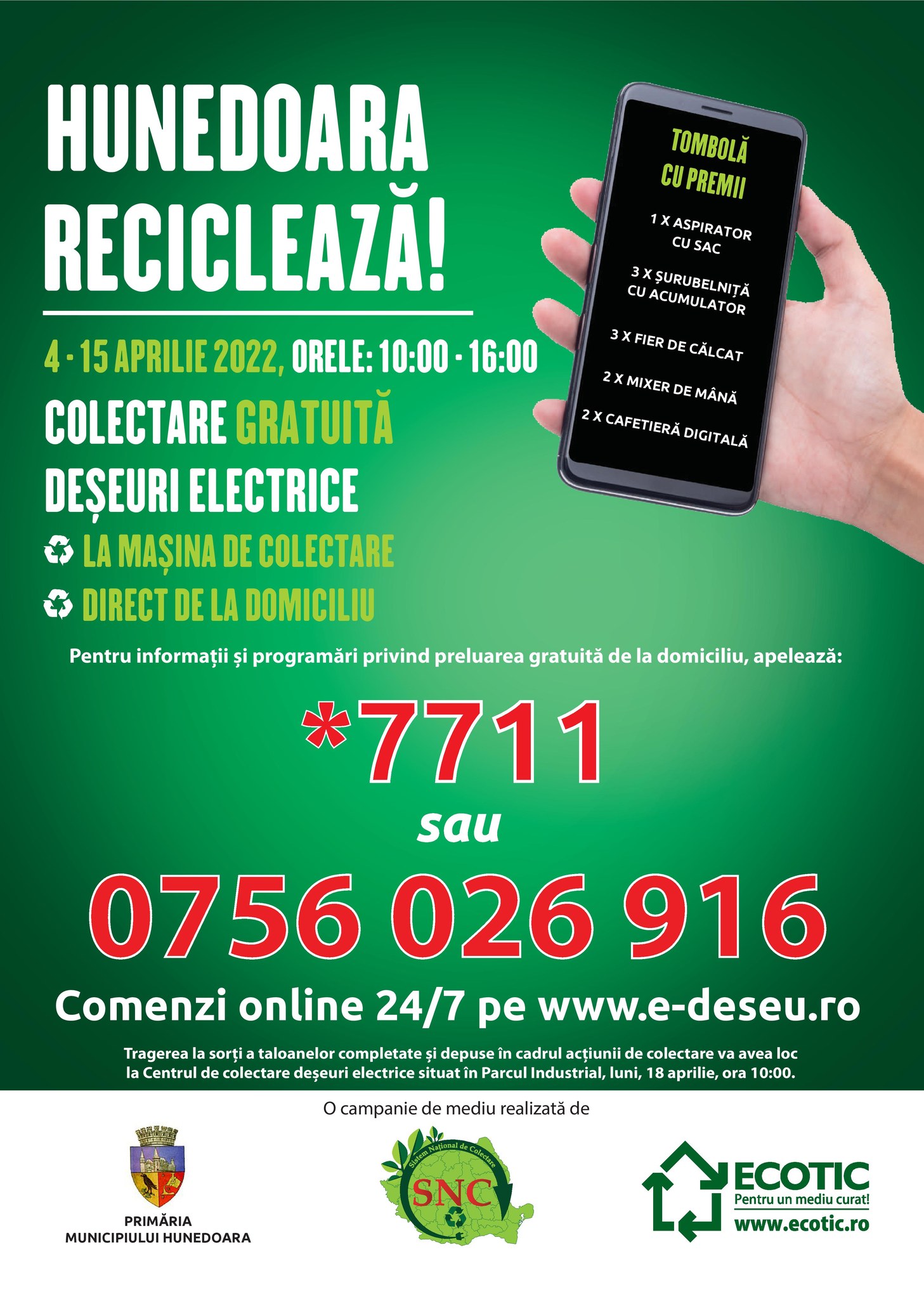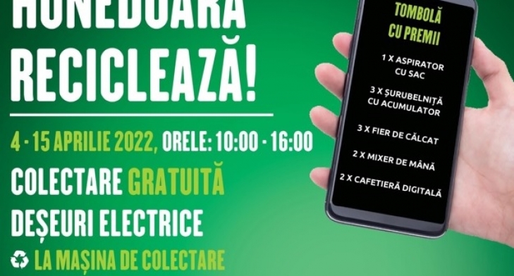 Scapă GRATUIT de aparatele electrice și electrocasnice vechi sau defecte, în perioada 4 – 15 aprilie 2022, apelând numerele de telefon *7711 sau 0756-026916 pentru informații și programări privind ridicarea gratuită de la domiciliu a deșeurilor!