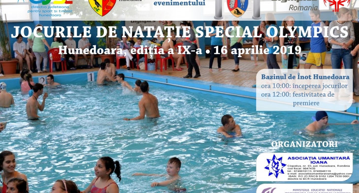 Asociația Umanitară „Ioana" și Centrul de Pedagogie Curativă Simeria, în parteneriat cu Primăria Hunedoara, Direcția Județeană pentru Sport și Tineret Hunedoara, Consiliul Județean Hunedoara și Special Olympics România, vă invită marți, 16 aprilie 2019, la JOCURILE DE NATAȚIE SPECIAL OLYMPICS Hunedoara 2019.