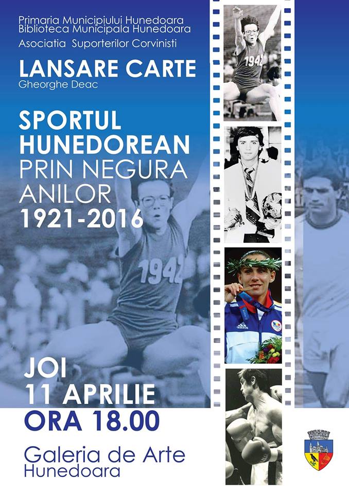 Primăria Municipiului Hunedoara, Biblioteca Municipală și Asociația Suporterilor Corviniști organizează joi, 11 aprilie, de la ora 18:00, la Galeria de Arte din municipiul Hunedoara, lansarea volumului „Sportul hunedorean prin negura anilor 1921-2016”. Autorul cărții este GHEORGHE DEAC.