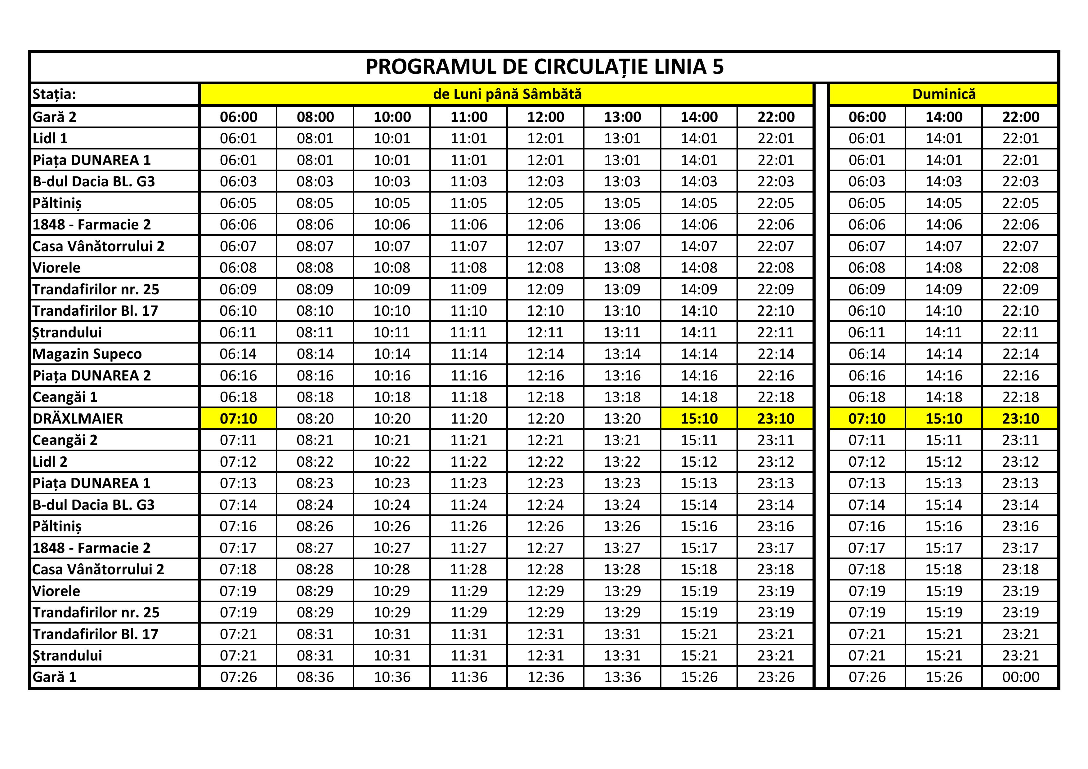 Luni - Sâmbătă: 6:00, 8:00, 10:00, 11:00, 12:00, 13:00, 14:00, 22:00.