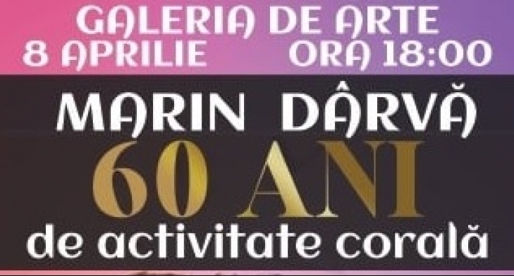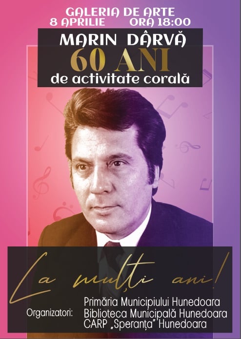 Vă invităm în data de 8 aprilie 2022, începând cu ora 18:00, la Galeria de Arte din Hunedoara, să-l celebrăm pe maestrul Marin Dârvă, la aniversarea a 60 de ani de activitate corală.