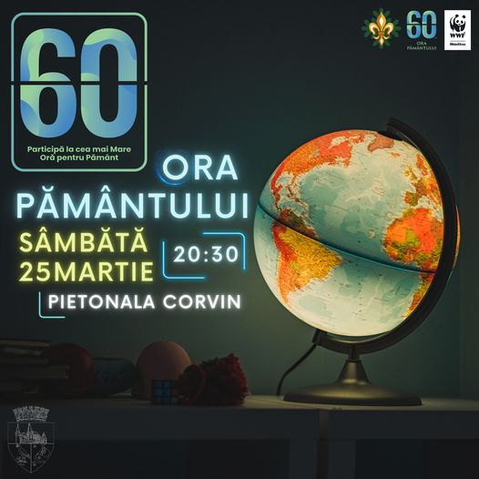 Sâmbătă, 25 martie, de la ora 20:30, împreună cu Cercetașii României - Hunedoara, vom opri, timp de o oră, iluminatul arhitectural al Casei de Cultură și de pe Pietonala Corvin , precum și de pe strada George Enescu (parțial).