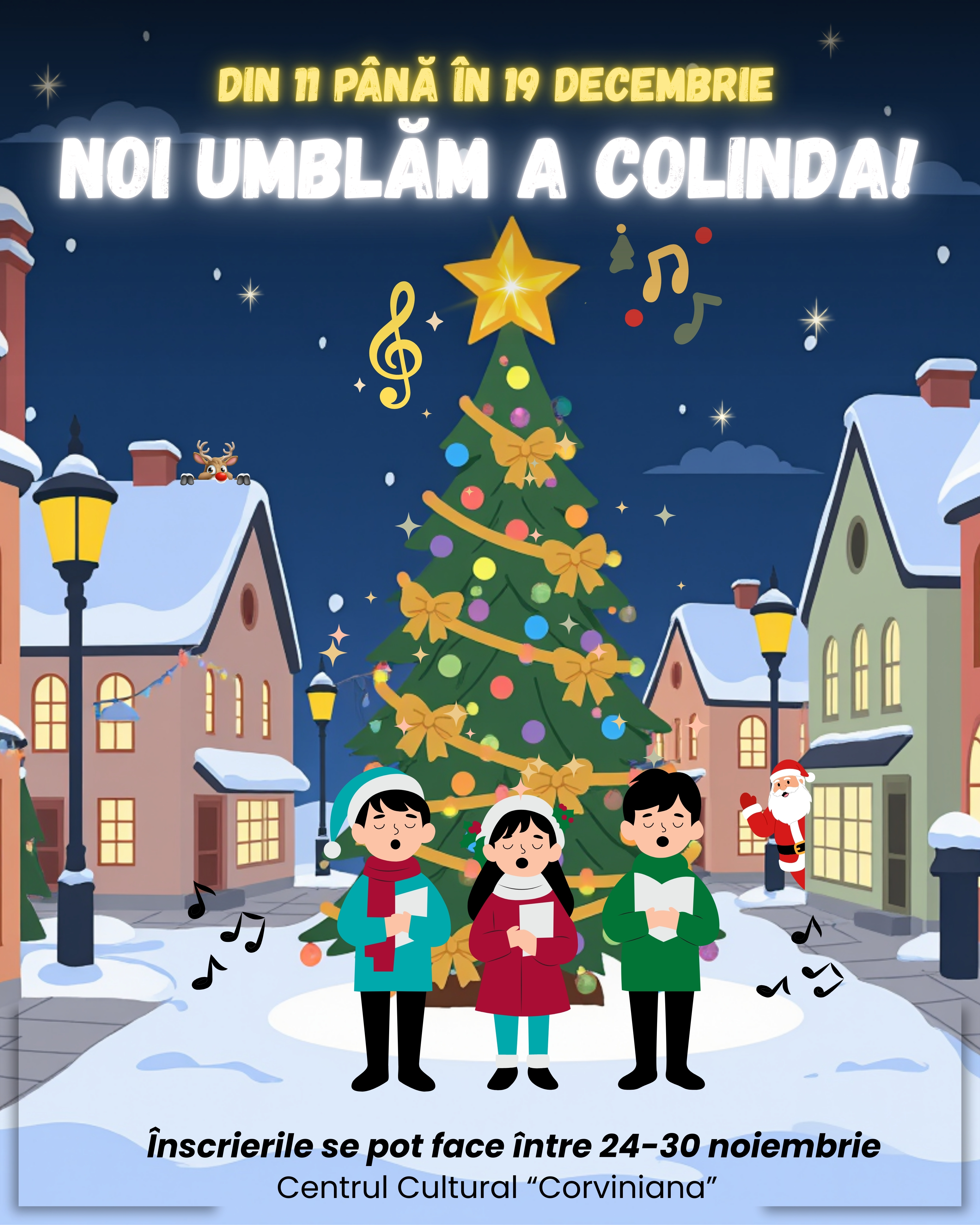 Începând din 11 decembrie 2025, grupurile de colindători sunt așteptate în fața Casei de Cultură din municipiul Hunedoara. Programul de colinde se va desfășura în perioada 11.12.2025 - 19.12.2025, începând cu orele 16.30. Copiii vor primi plase cu dulciuri!