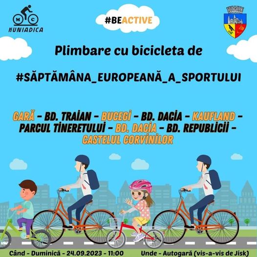 • Duminică, 24 septembrie, de la ora 11:00 – Plimbare cu bicicletele, pe traseul: Gară – Bd. Traian – Bucegi – Bd. Dacia – Kaufland – Parcul Tineretului – Bd. Dacia – Bd. Republicii – Castelul Corvinilor – eveniment organizat de Asociația MC Huniadica