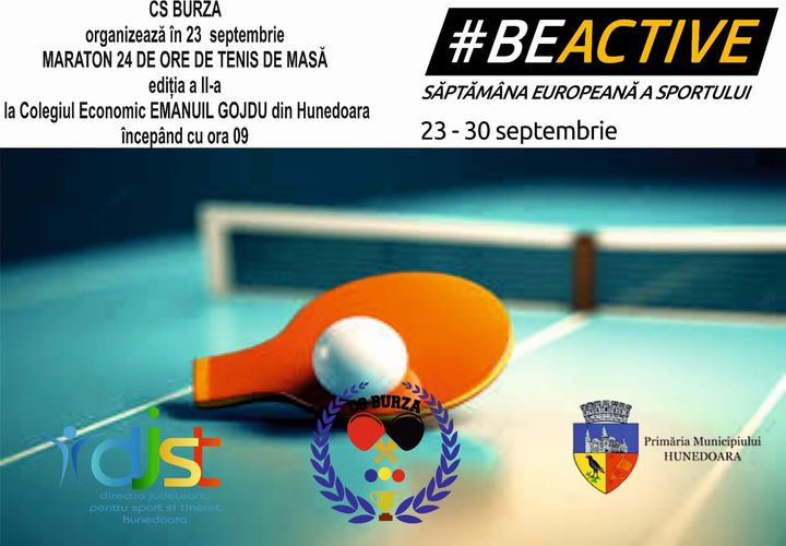 • Sâmbătă, 23 septembrie, de la ora 09:00 – Maraton de Tenis de Masă, la Colegiul Economic „Emanuil Gojdu” Hunedoara – eveniment organizat de Clubul Sportiv Burza