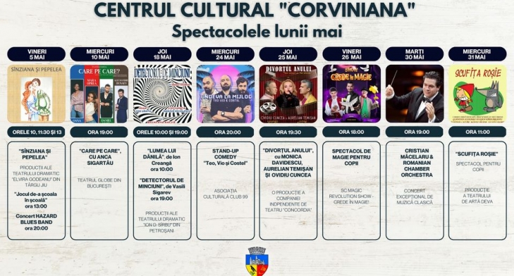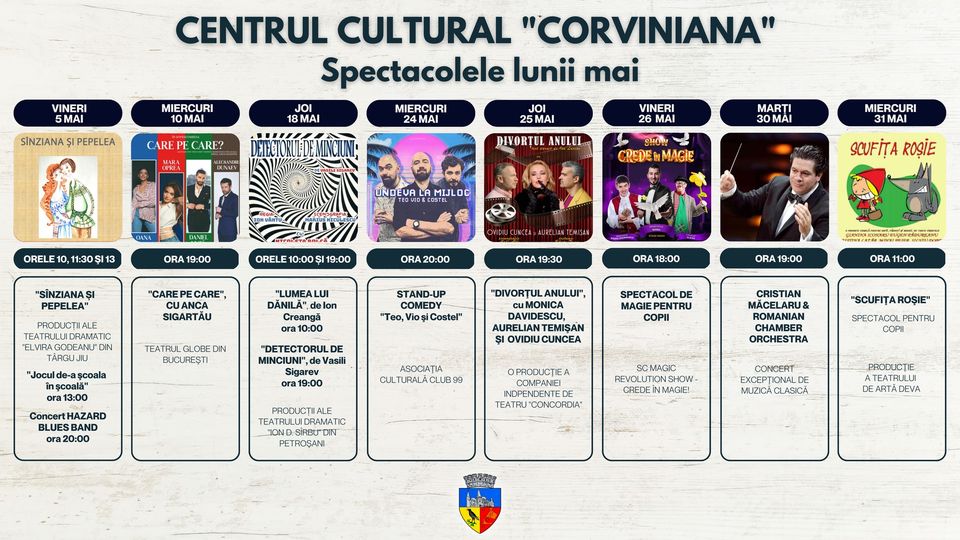 Luna MAI ne surprinde cu nenumărate și diverse spectacole la Centrul Cultural Corviniana, după cum urmează: