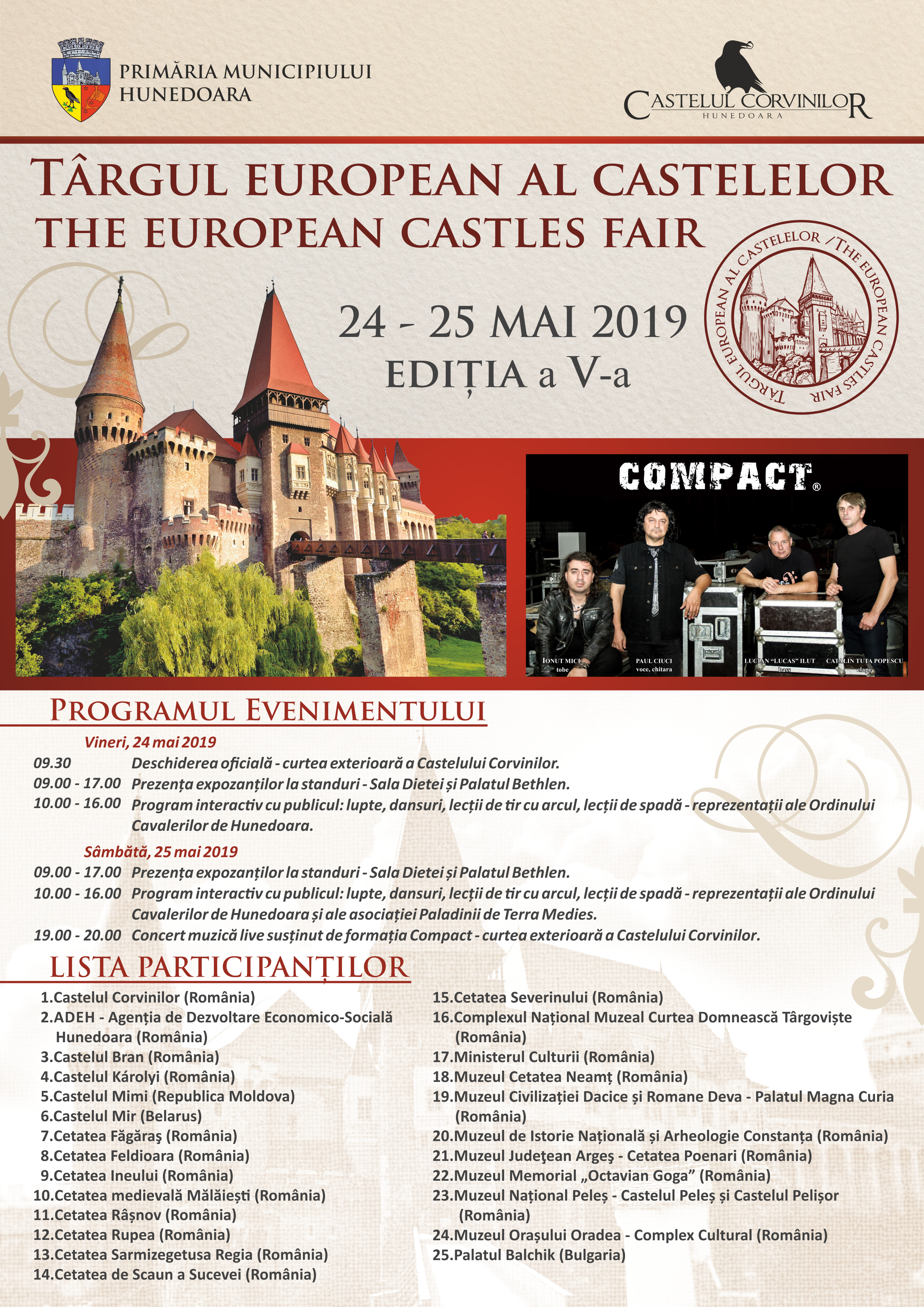 Primăria Municipiului Hunedoara și Castelul Corvinilor vă invită în perioada 24 - 25 mai 2019 la cea de-a V-a ediție a Târgului European al Castelelor, un eveniment unic în România care doreşte să promoveze frumuseţea monumentelor istorice din țară și din Europa.