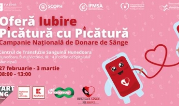 Vă așteptăm în perioada 27 februarie-3 martie la Centrul de Transfuzie Sanguină Hunedoara, Str. Victoriei, nr. 14 (Policlinica Spitalului Municipal), de luni până vineri, între orele 07:00 și 13:00.